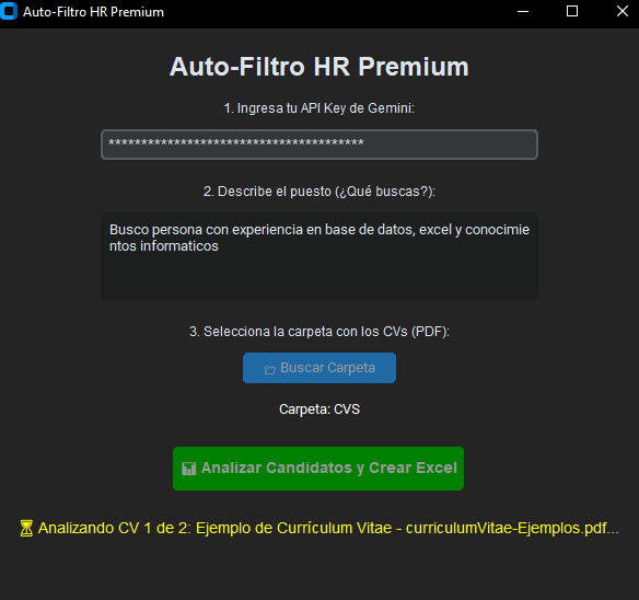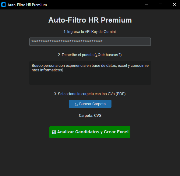 Diseñado para empresas modernas y reclutadores, nuestro software de escritorio utiliza Inteligencia Artificial avanzada para leer masivamente todos los currículums de una carpeta, evaluarlos contra tu descripción de puesto ideal y entregarte un reporte en Excel listo para tomar decisiones.