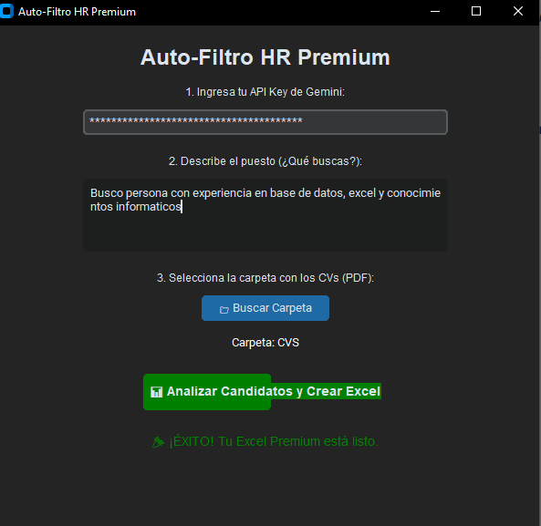 Generar Excel: Haz clic en el botón verde. El software analizará todos los documentos y creará automáticamente el archivo Reporte_Premium_Candidatos.xlsx en esa misma carpeta. ¡Listo para contratar!