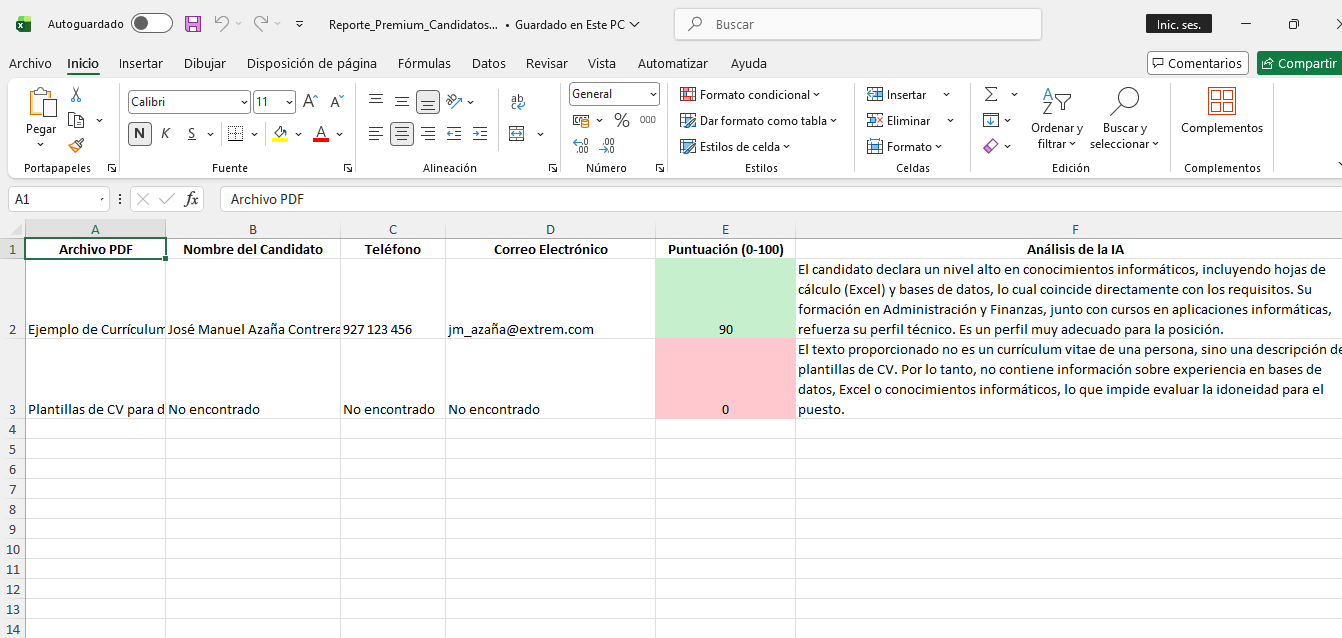 ✅Extracción Automática de Contactos: Olvídate de volver a abrir el PDF para buscar el número del candidato. La IA extrae el Nombre, Teléfono y Correo Electrónico y los pone en columnas ordenadas para que llames al instante.